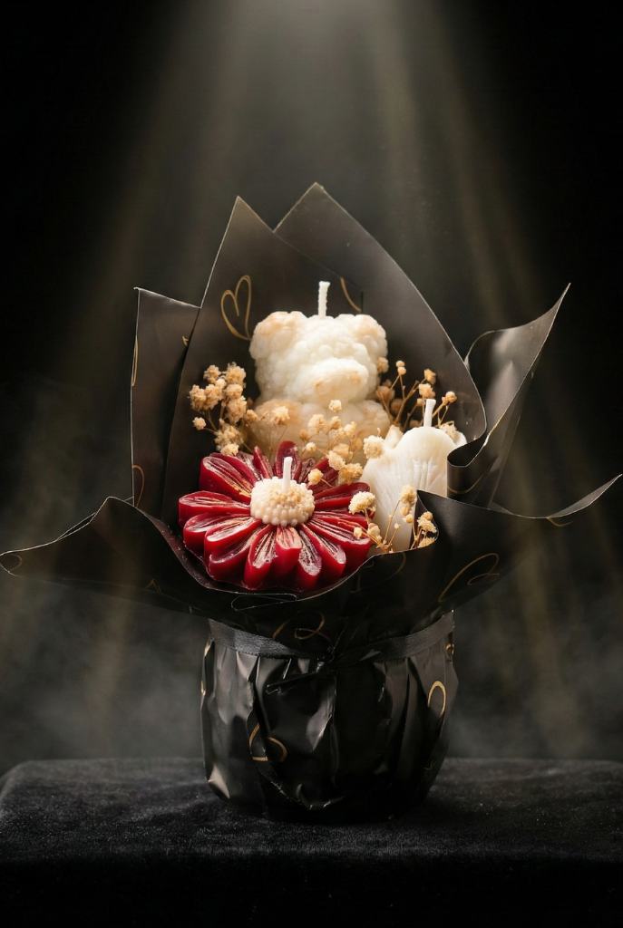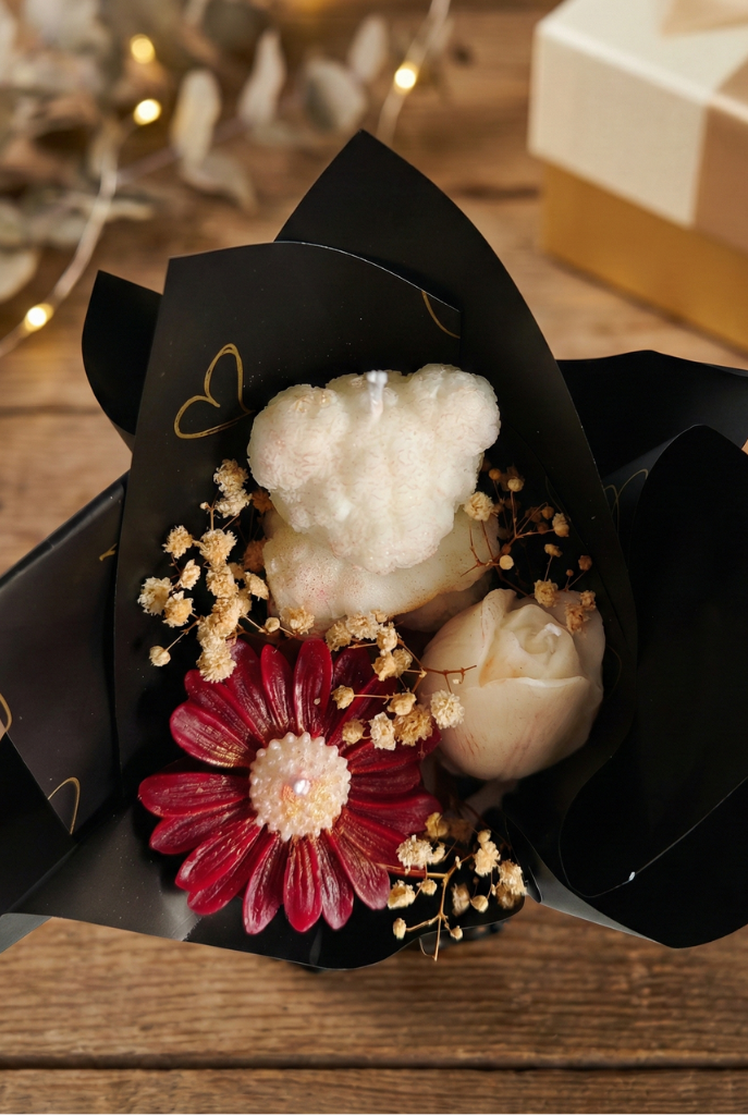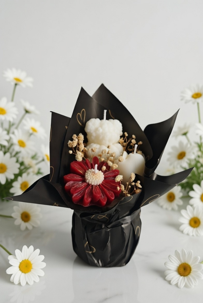 Romantizmin cesur dokunuşu: El emeğiyle şekillendirilmiş kırmızı papatya mum çiçeği, beyaz kalp ve Ayıcık tasarımlı mumlar ile zarifçe birleşiyor. Doğal taş tozu vazoda sunulan bu özel set, kuru gypsophila detaylarıyla tamamlanıyor. Siyah altın kalp desenli ambalaj ve siyah kurdele bow ile paketlenmiş – seçkin zevklere, unutulmaz anlara hitap eder.