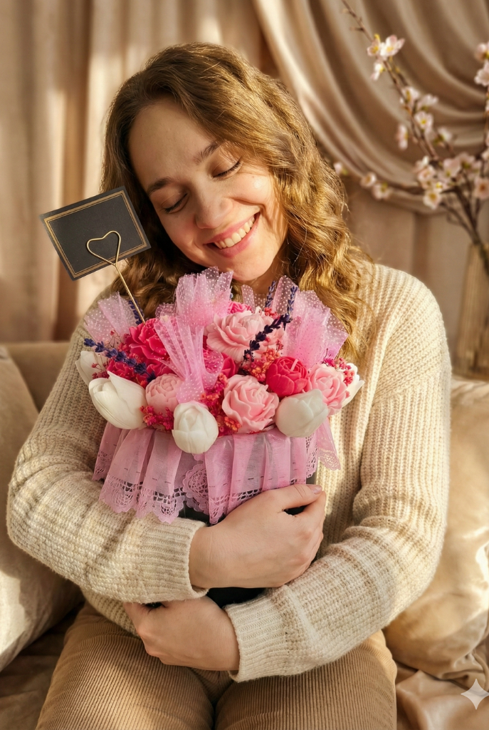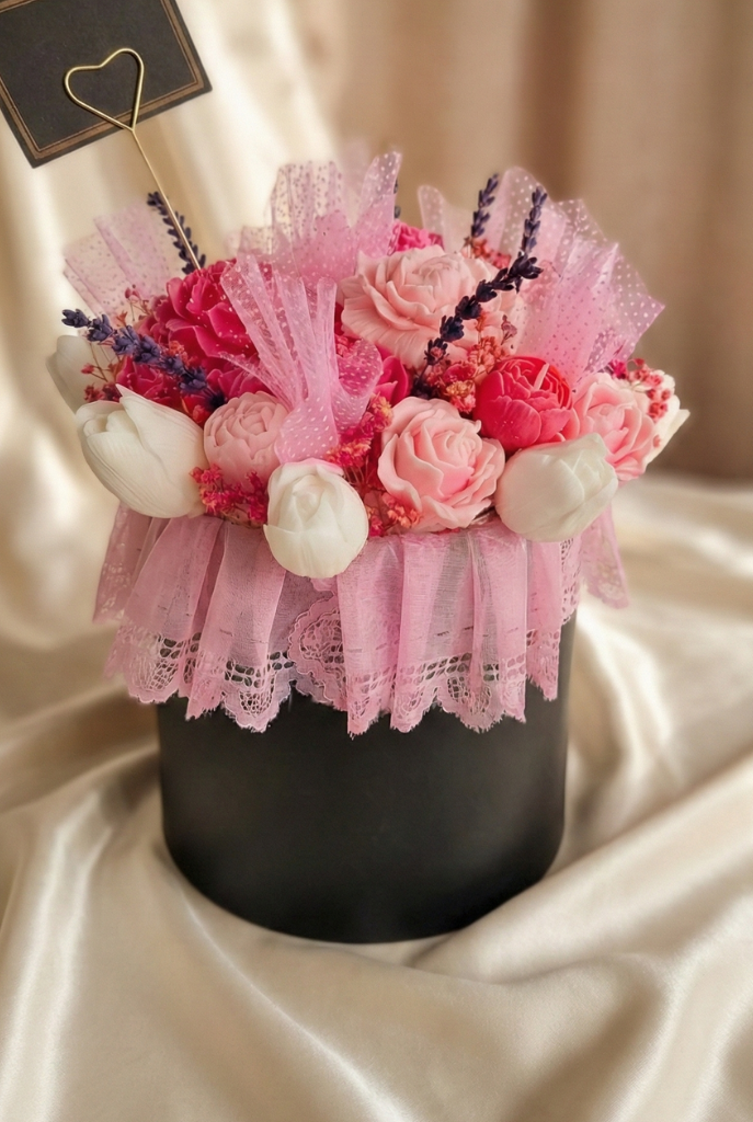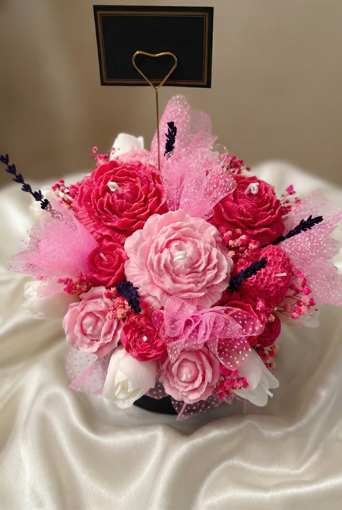 Luna Rosé, gerçek çiçek görünümünde tasarlanmış el yapımı mum çiçeklerden oluşan özel bir aranjmandır.