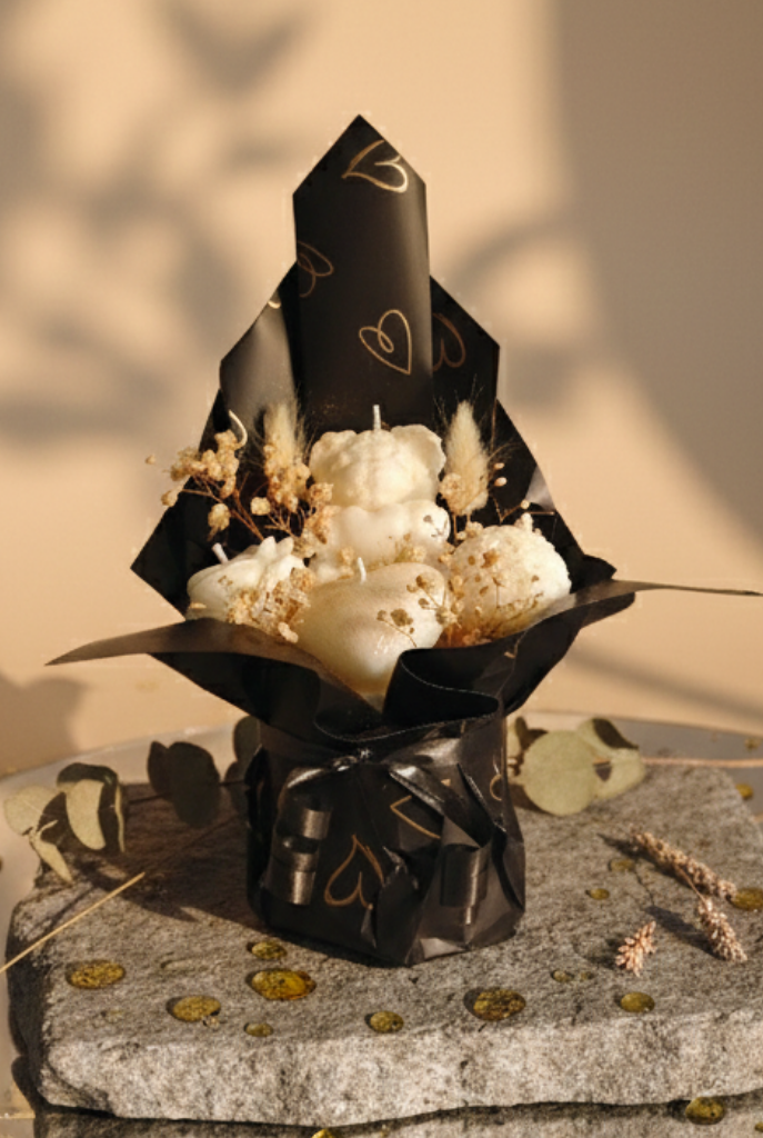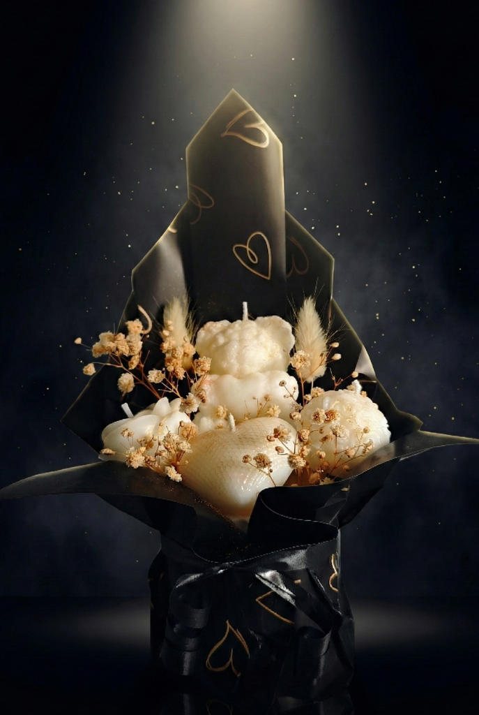 Premium bir dokunuş arayanlar için tasarlandı: El emeğiyle şekillendirilmiş kokulu mum çiçekleri, doğal taş tozu vazoda zarifçe sunuluyor. Gerçek çiçeklerin kalıcılığı ve lüks kokunun birleşimiyle, sıradan hediyeleri geride bırakın. Siyah altın kalp desenli ambalajımız ve siyah saten kurdeleyle paketlenmiş bu özel set, seçkin zevklere hitap eder.